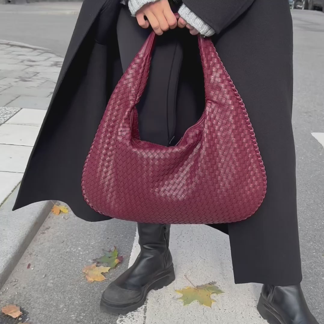 En elegant axelväska i högkvalitativt veganskt läder med vacker vävd textur och tidlös design. Den halvmåneformade siluetten kombineras med en rymlig interiör och dragkedja som håller dina väsentligheter säkra.