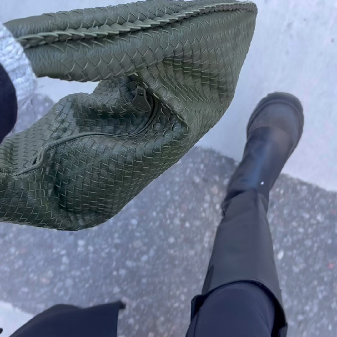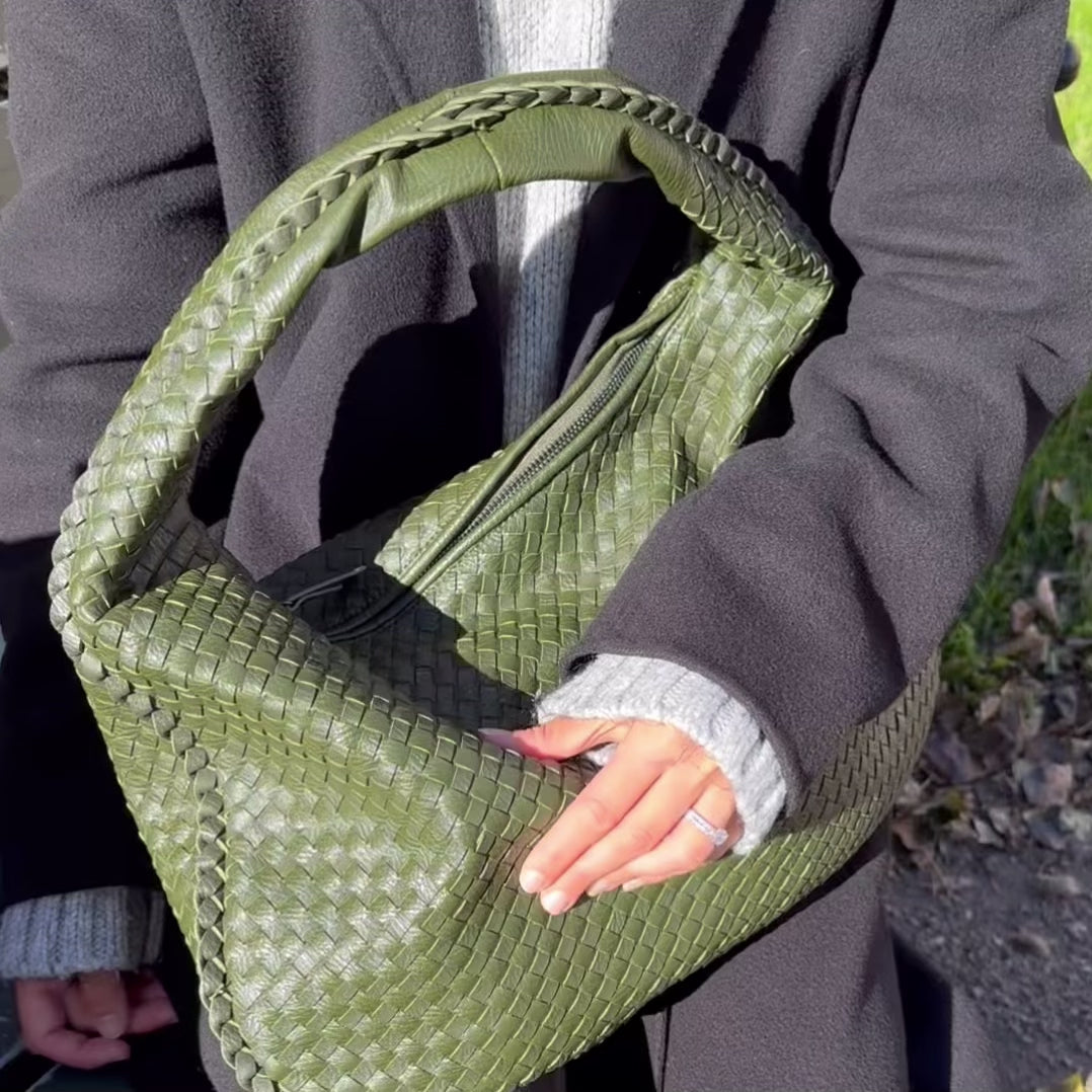 En elegant axelväska i högkvalitativt veganskt läder med vacker vävd textur och tidlös design. Den halvmåneformade siluetten kombineras med en rymlig interiör och dragkedja som håller dina väsentligheter säkra.